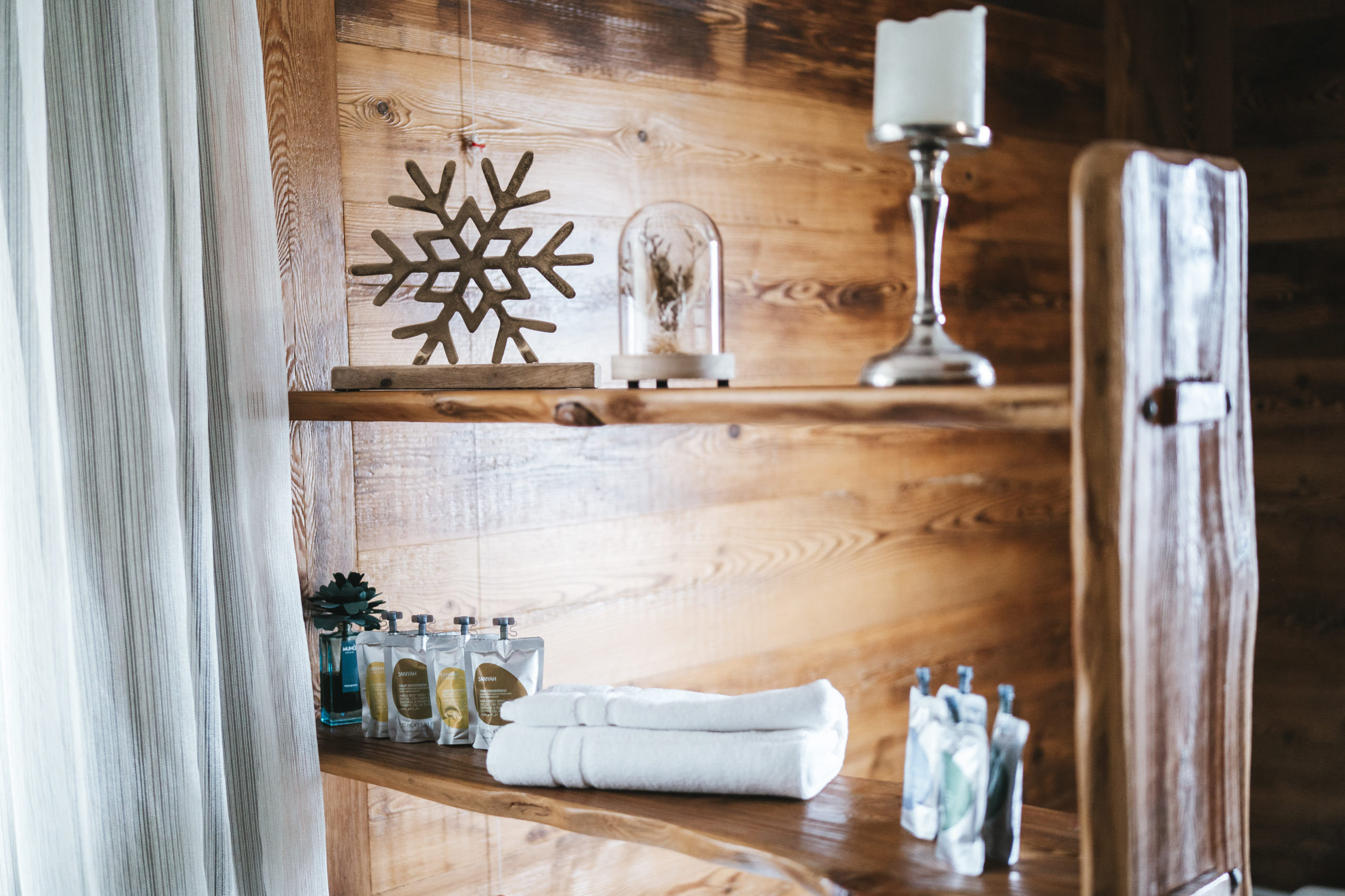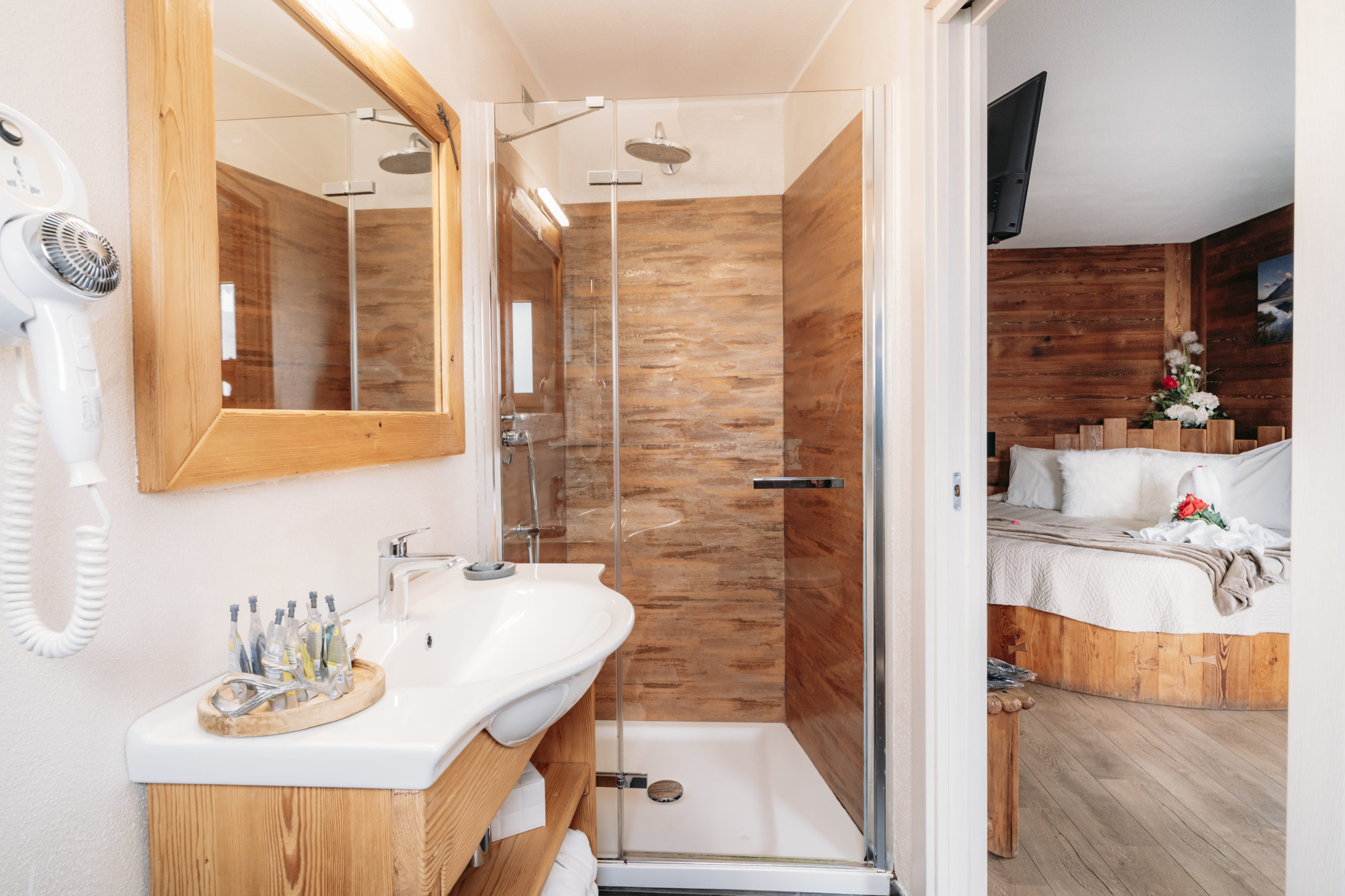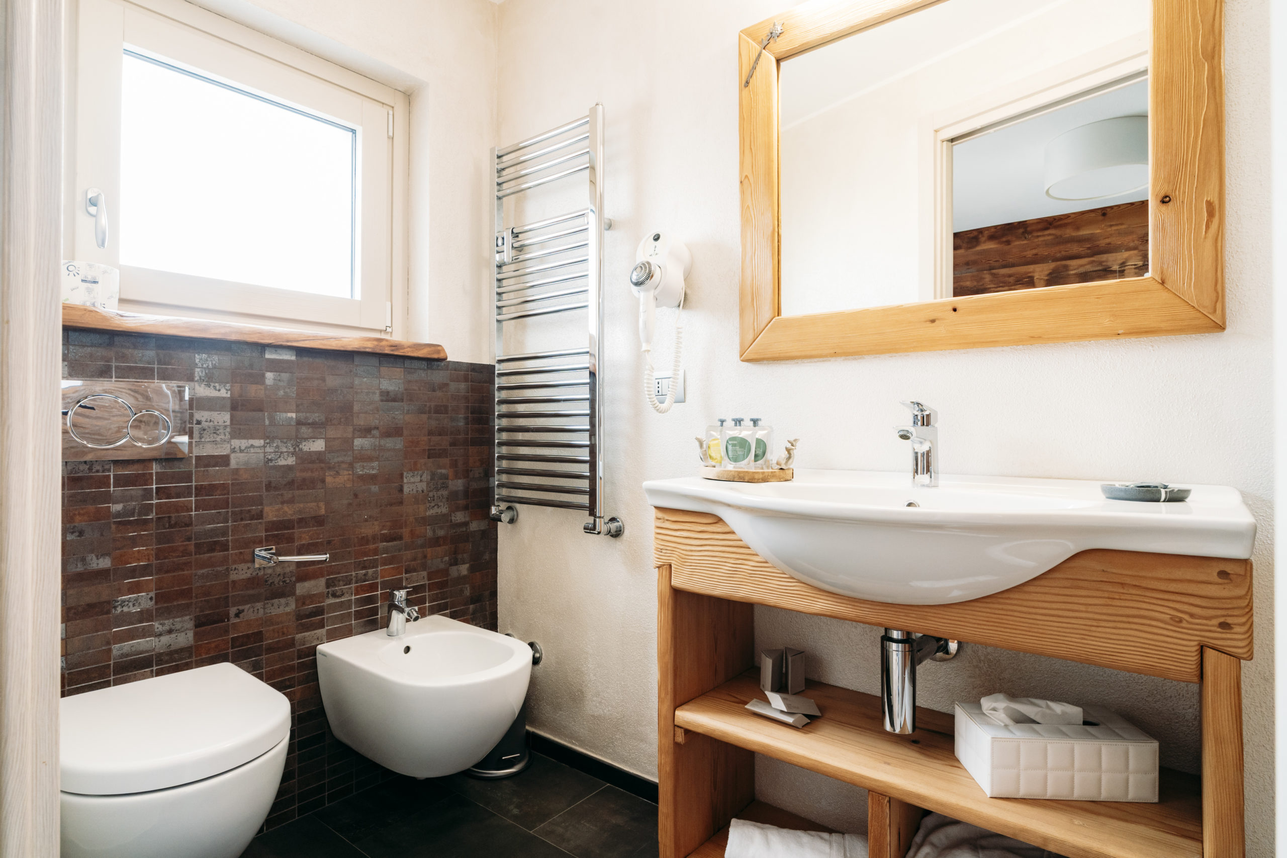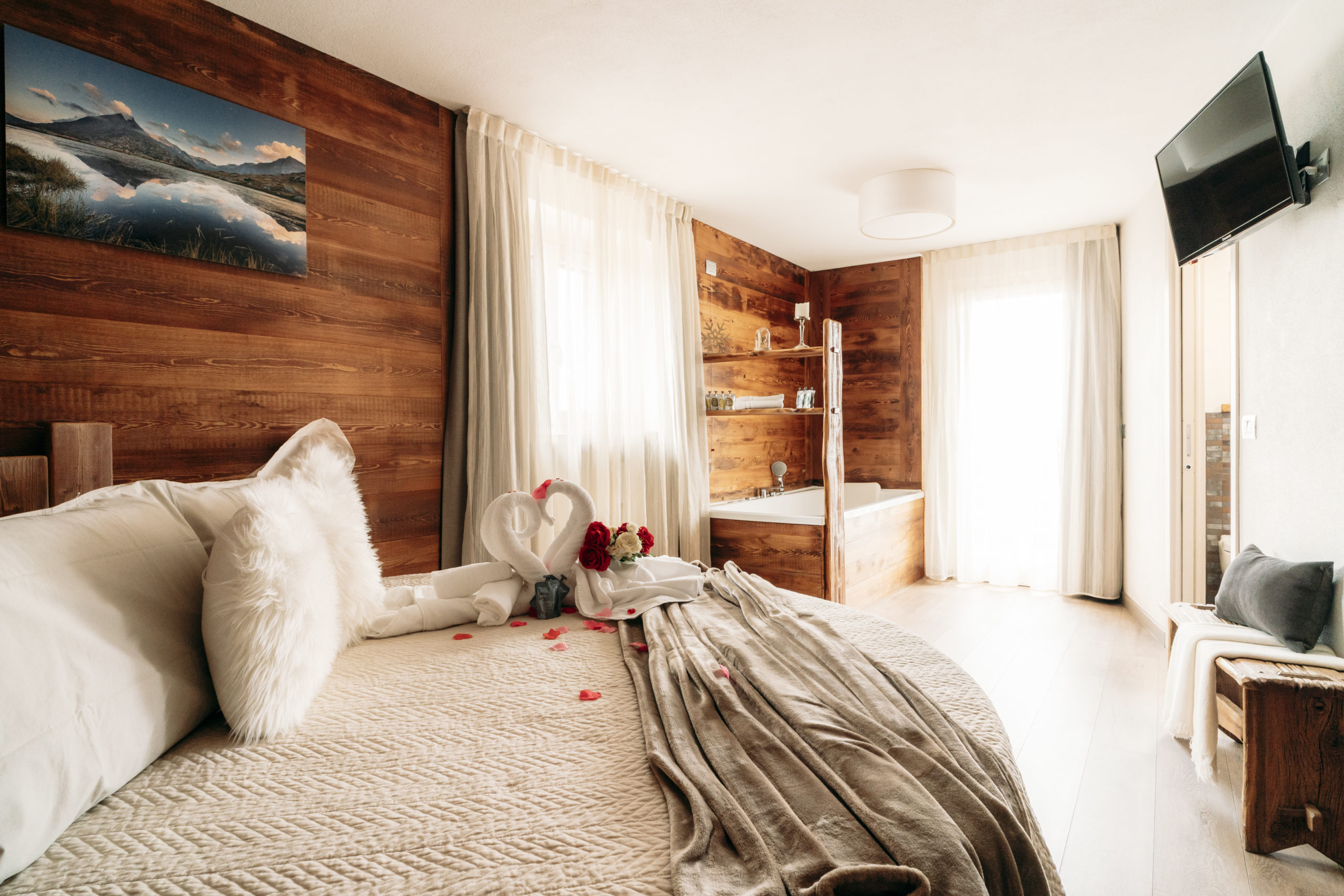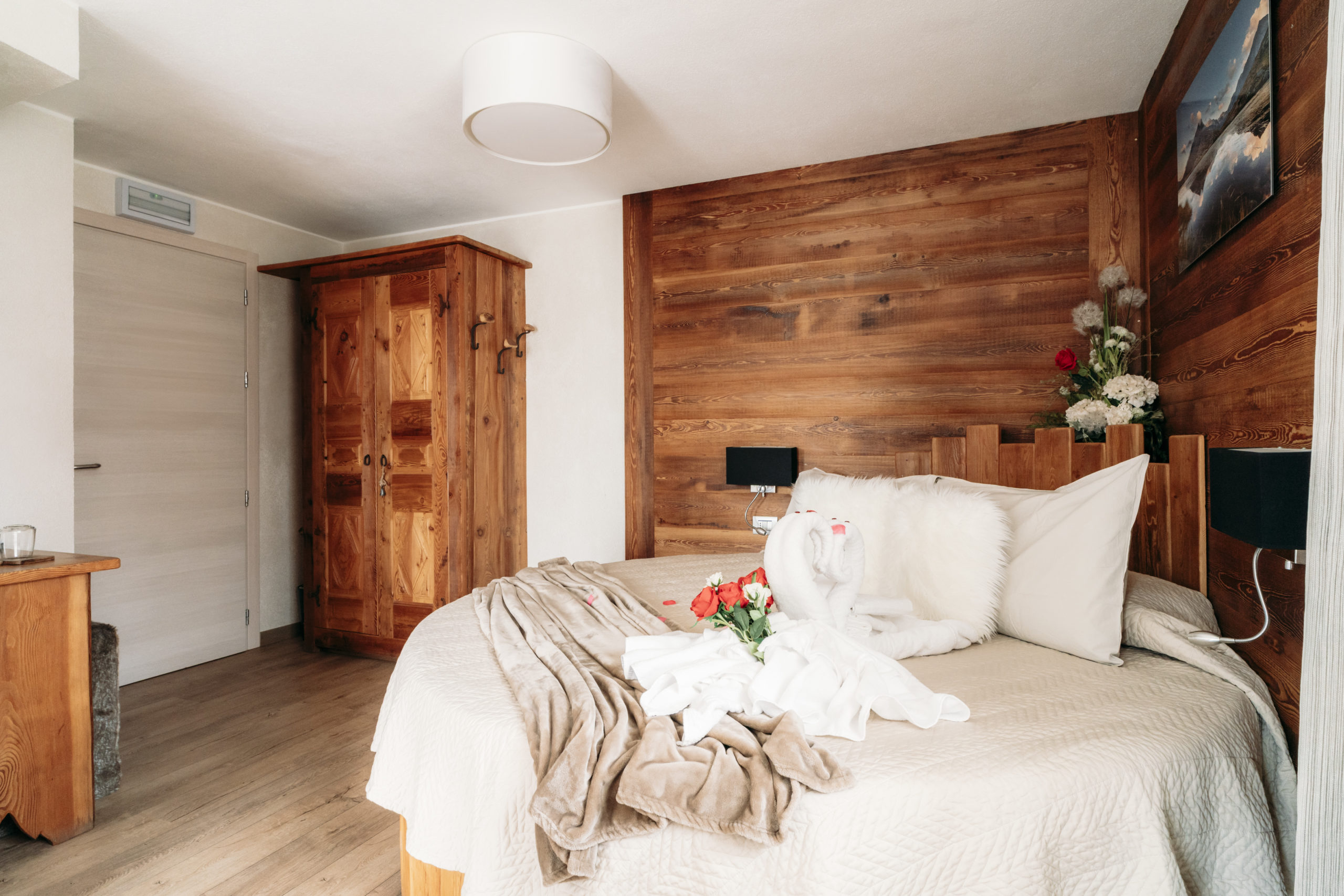 Gli arredi, in stile rustico con finiture di pregio e illuminazione a LED, creano un atmosfera calda e raffinata. Il balcone privato offre una splendida vista sul paese.