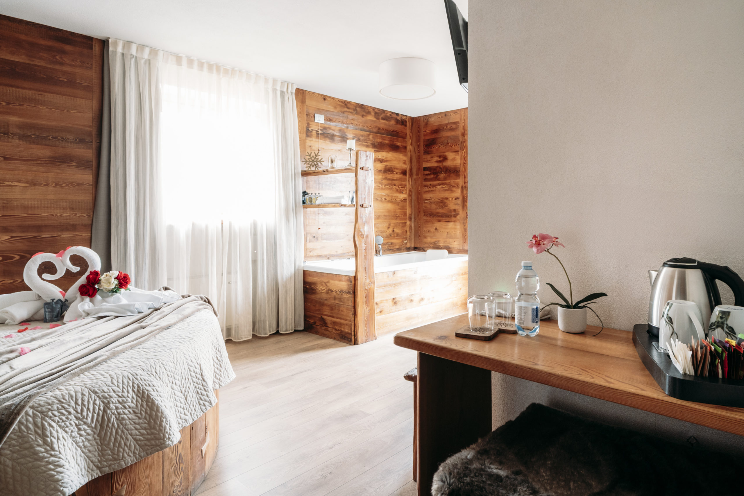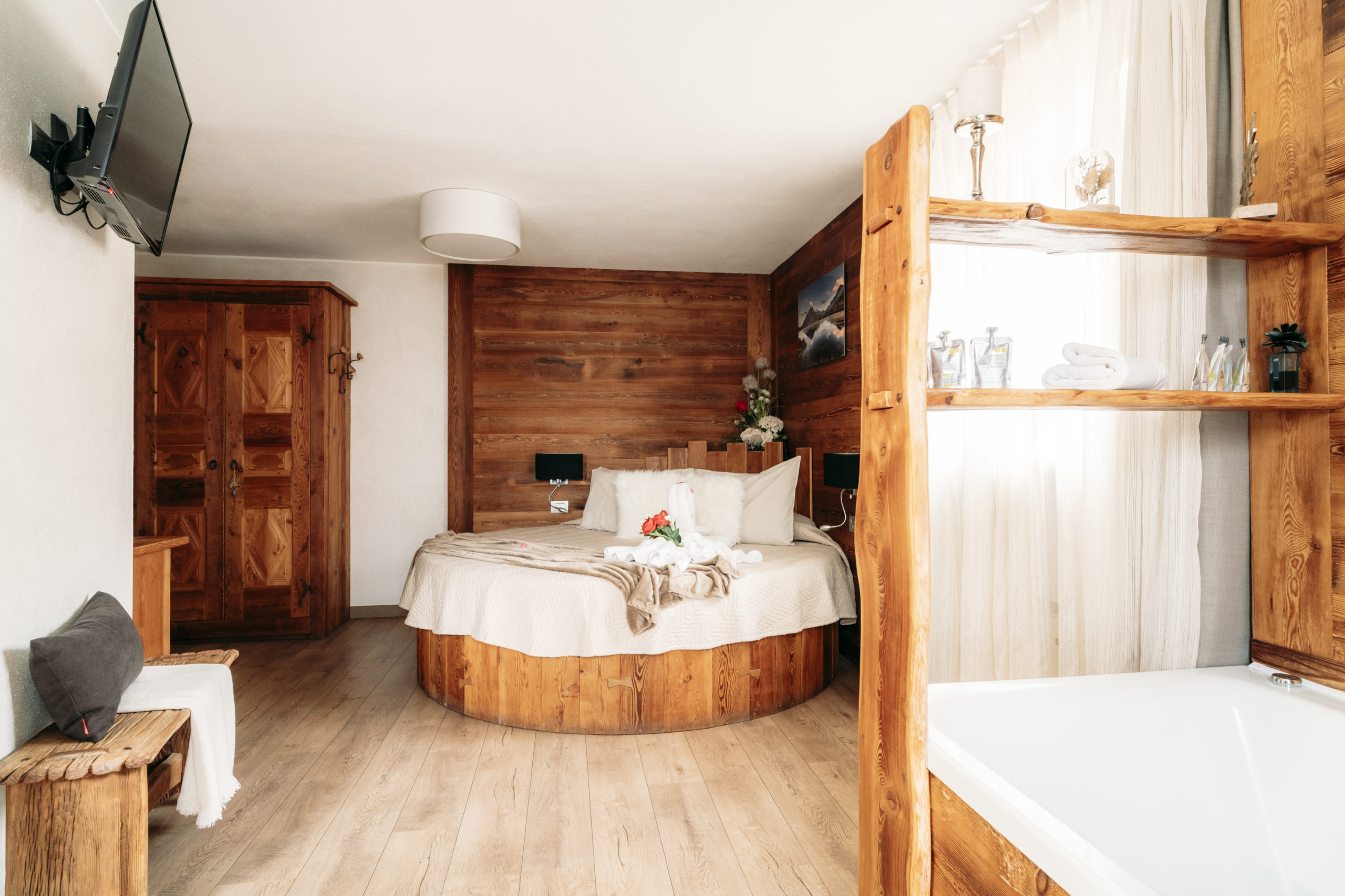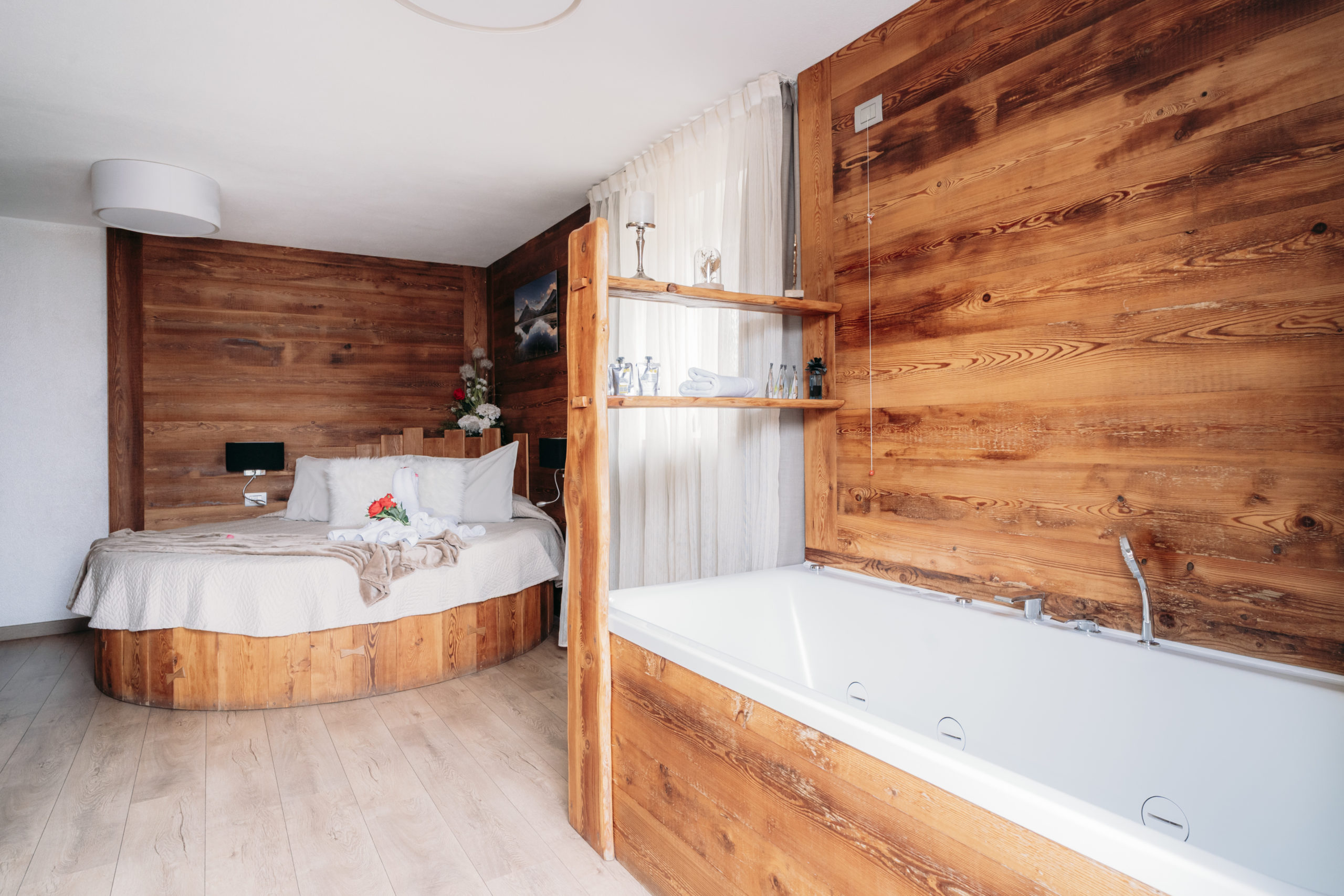 Situata al secondo piano, la nostra Suite Deluxe accoglie gli ospiti con suggestivo letto rotondo in legno e una vasca idromassaggio privata all’interno della camera.